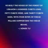 He built the House of the Forest of Lebanon a hundred cubits long, fifty cubits wide, and thirty cubits high, with four rows of cedar pillars supporting the cedar beams.