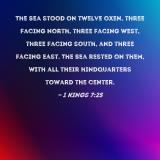 The Sea stood on twelve oxen, three facing north, three facing west, three facing south, and three facing east. The Sea rested on them, with all their hindquarters toward the center.