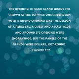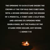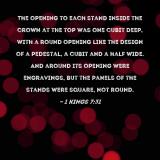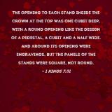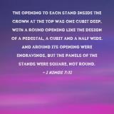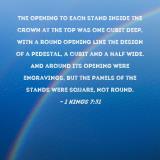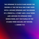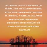 Pictures and Artwork The opening to each stand inside the crown at the top was one cubit deep, with a round opening like the design of a pedestal, a cubit and a half wide. And around its opening were engravings, but the panels of the stands were square, not round. |