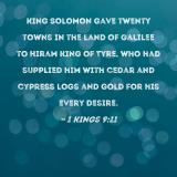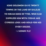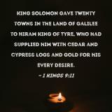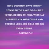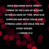 King Solomon gave twenty towns in the land of Galilee to Hiram king of Tyre, who had supplied him with cedar and cypress logs and gold for his every desire.