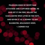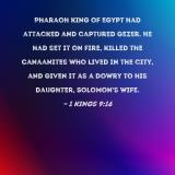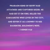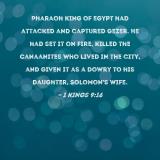 Pharaoh king of Egypt had attacked and captured Gezer. He had set it on fire, killed the Canaanites who lived in the city, and given it as a dowry to his daughter, Solomon's wife.