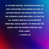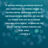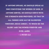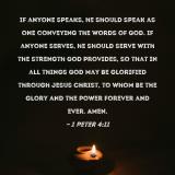 Pictures and Artwork If anyone speaks, he should speak as one conveying the words of God. If anyone serves, he should serve with the strength God provides, so that in all things God may be glorified through Jesus Christ, to whom be the glory and the power forever and ever. Amen. |