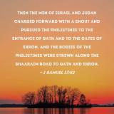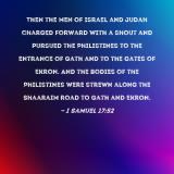 Then the men of Israel and Judah charged forward with a shout and pursued the Philistines to the entrance of Gath and to the gates of Ekron. And the bodies of the Philistines were strewn along the Shaaraim road to Gath and Ekron.