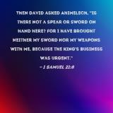 Then David asked Ahimelech, "Is there not a spear or sword on hand here? For I have brought neither my sword nor my weapons with me, because the king's business was urgent."