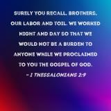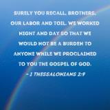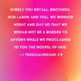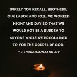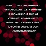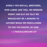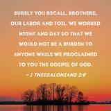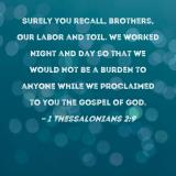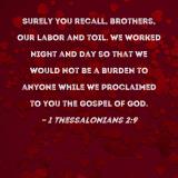 Surely you recall, brothers, our labor and toil. We worked night and day so that we would not be a burden to anyone while we proclaimed to you the gospel of God.