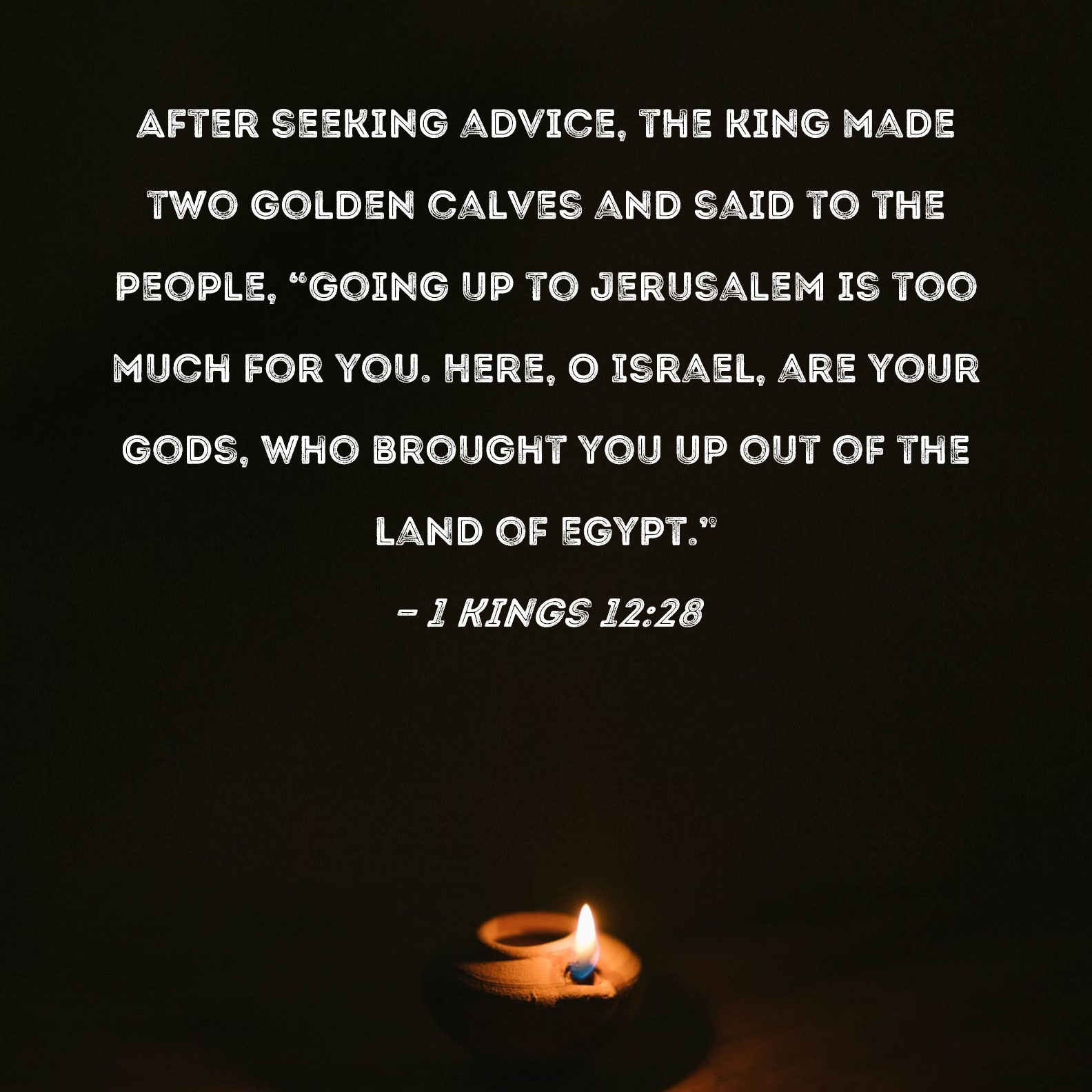 1 Kings 12:28 After seeking advice, the king made two golden calves and said to the people, "Going up to Jerusalem is too much for you. Here, O Israel, are your gods, who brought you up out of the land of Egypt."