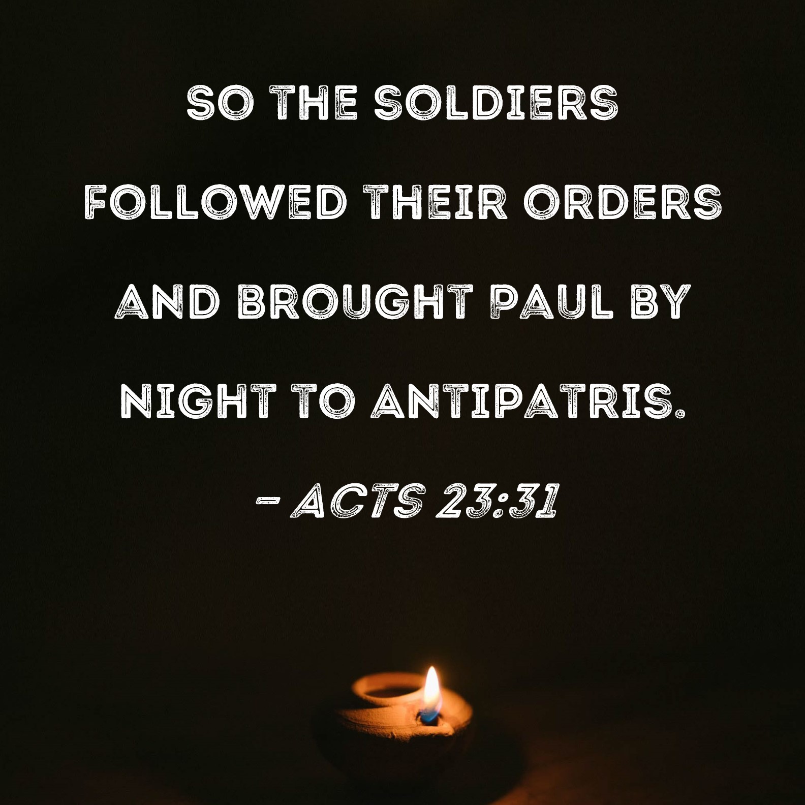 Acts 23:31 So the soldiers followed their orders and brought Paul by night to Antipatris.