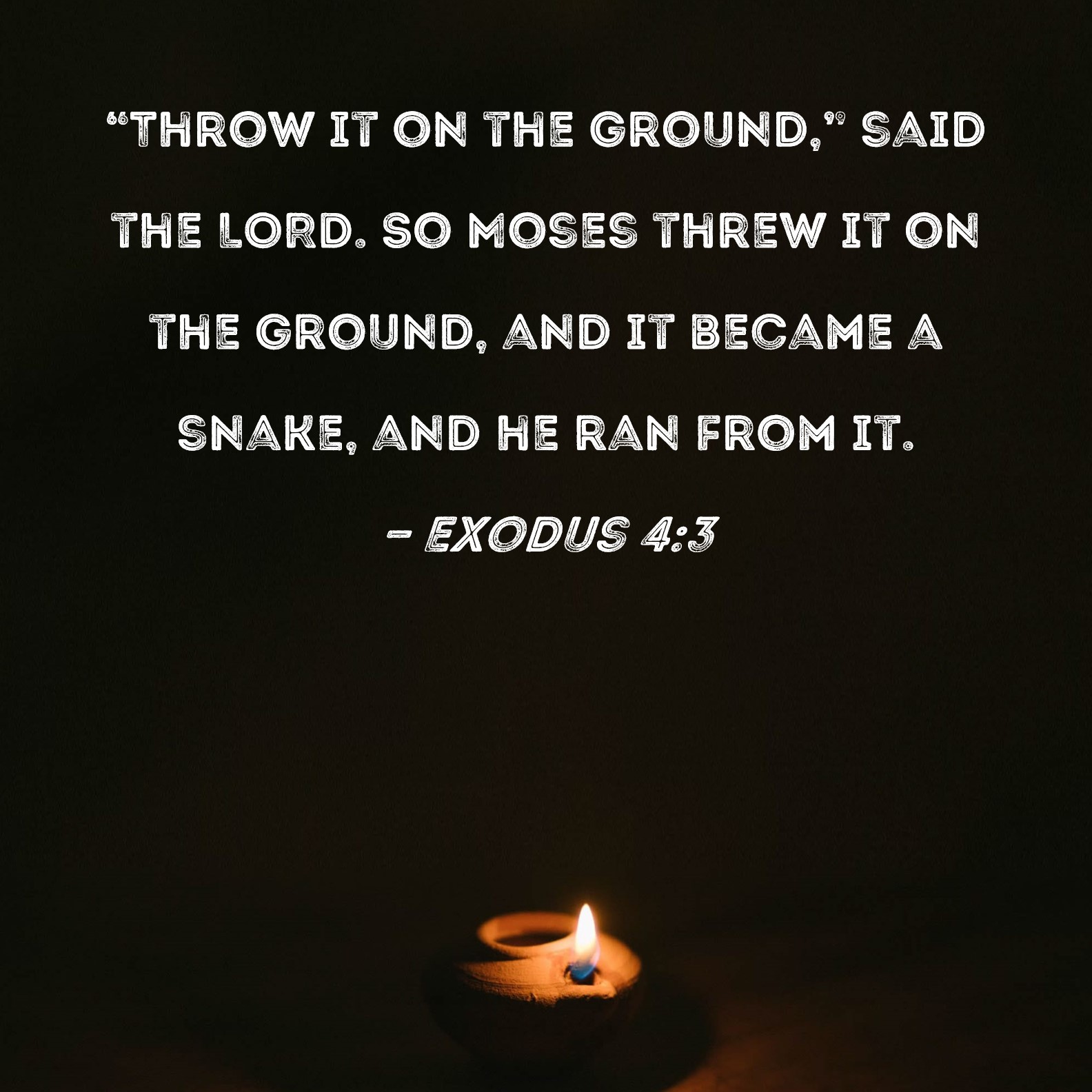 BSB: "Throw it on the ground," said the LORD. So Moses threw it on the ground, and it became a snake, and he ran from it. KJV: And he said, Cast it on the ground. And he cast it on the ground, and it became a serpent; and Moses fled from before it. DRB: And the Lord said: Cast it down upon the ground. He cast it down, and it was turned into a serpent: so that Moses fled from it. DBT: And he said, Cast it on the ground. And he cast it on the ground, and it became a serpent; and Moses fled from before it. ERV: And he said, Cast it on the ground. And he cast it on the ground, and it became a serpent; and Moses fled from before it. WBT: And he said, Cast it on the ground. And he cast it on the ground, and it became a serpent: and Moses fled from before it. WEB: He said, “Throw it on the ground.” He threw it on the ground, and it became a snake; and Moses ran away from it. YLT: and He saith, 'Cast it to the earth;' and he casteth it to the earth, and it becometh a serpent — and Moses fleeth from its presence.Links Exodus 4:3 NIV • Exodus 4:3 NLT • Exodus 4:3 ESV • Exodus 4:3 NASB • Exodus 4:3 KJV • Exodus 4:3 Interlinear • Exodus 4:3 Commentaries • Exodus 4:3 Parallel Texts • Exodus 4:3 Bible Apps • Exodus 4:3 Parallel • Bible Hub |