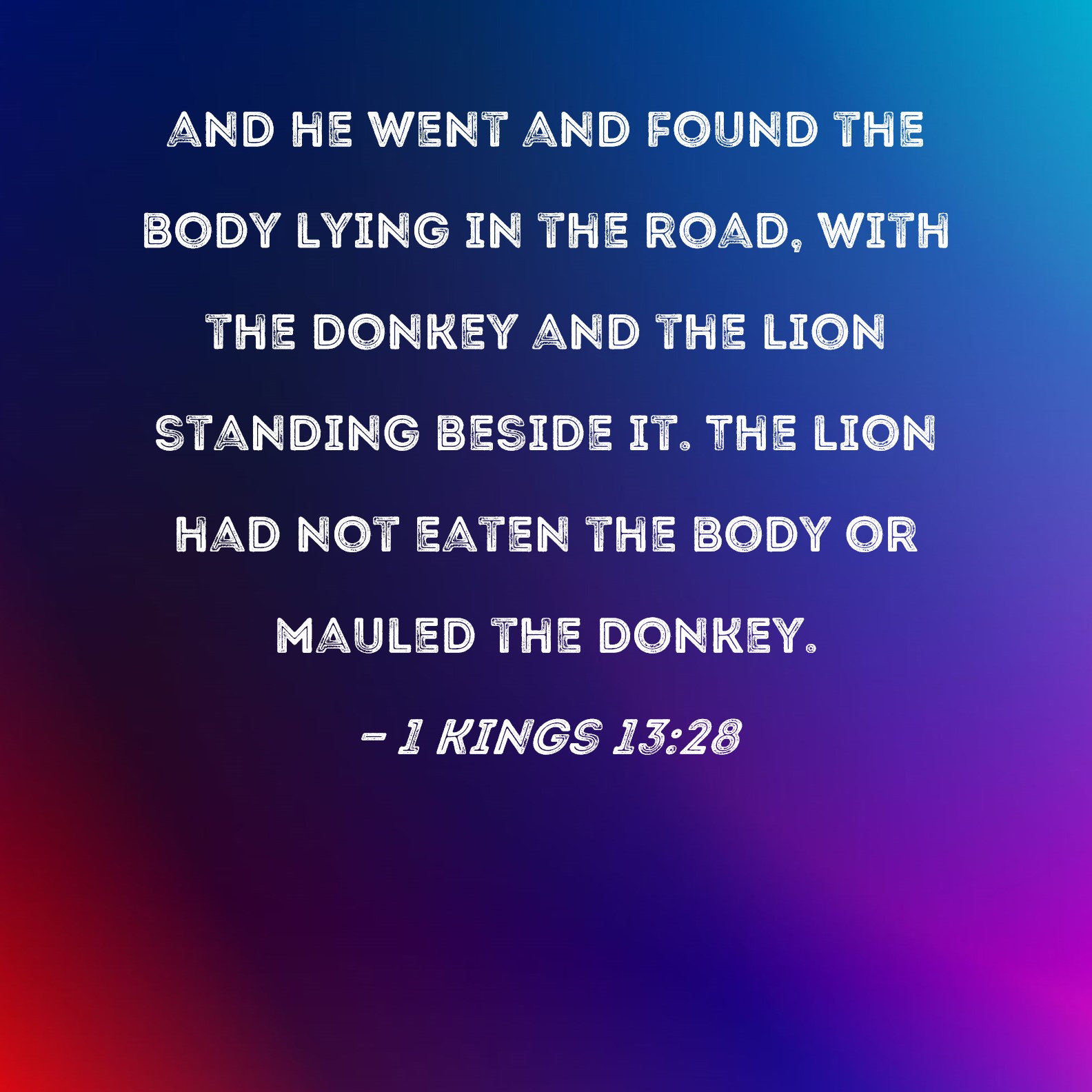 BSB: and he went and found the body lying in the road, with the donkey and the lion standing beside it. The lion had not eaten the body or mauled the donkey. KJV: And he went and found his carcase cast in the way, and the ass and the lion standing by the carcase: the lion had not eaten the carcase, nor torn the ass. DRB: And he was gone, he found the dead body cast in the way, and the ass and the lion standing by the carcass: the lion had not eaten of the dead body, nor hurt the ass. DBT: And he went and found his corpse cast in the way, and the ass and the lion standing by the corpse: the lion had not eaten the corpse, nor torn the ass. ERV: And he went and found his carcase cast in the way, and the ass and the lion standing by the carcase: the lion had not eaten the carcase, nor torn the ass. WBT: And he went and found his carcass cast in the way, and the ass and the lion standing by the carcass: the lion had not eaten the carcass, nor torn the ass. WEB: He went and found his body thrown on the path, and the donkey and the lion standing by the body. The lion had not eaten the body nor mauled the donkey. YLT: And he goeth and findeth his carcase cast in the way, and the ass and the lion are standing near the carcase — the lion hath not eaten the carcase nor destroyed the ass.Links 1 Kings 13:28 NIV • 1 Kings 13:28 NLT • 1 Kings 13:28 ESV • 1 Kings 13:28 NASB • 1 Kings 13:28 KJV • 1 Kings 13:28 Interlinear • 1 Kings 13:28 Commentaries • 1 Kings 13:28 Parallel Texts • 1 Kings 13:28 Bible Apps • 1 Kings 13:28 Parallel • Bible Hub |
