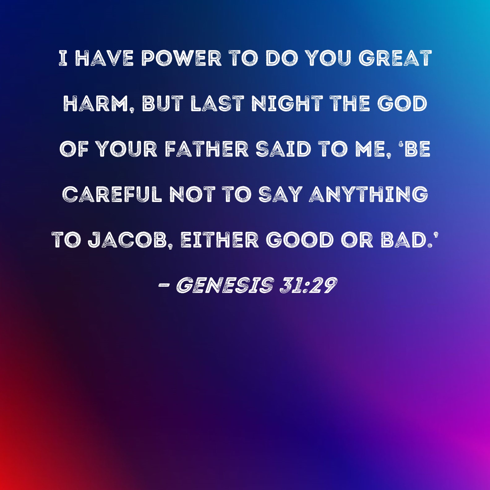 Genesis 31:29 I have power to do you great harm, but last night the God of your father said to me, 'Be careful not to say anything to Jacob, either good or bad.'