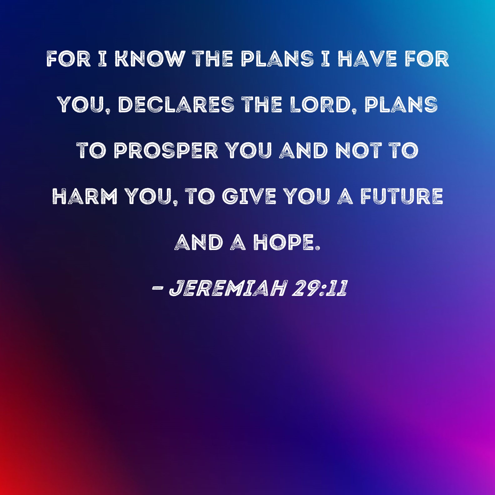 Jeremiah 29:11 For I know the plans I have for you, declares the LORD, plans to prosper you and not to harm you, to give you a future and a hope.