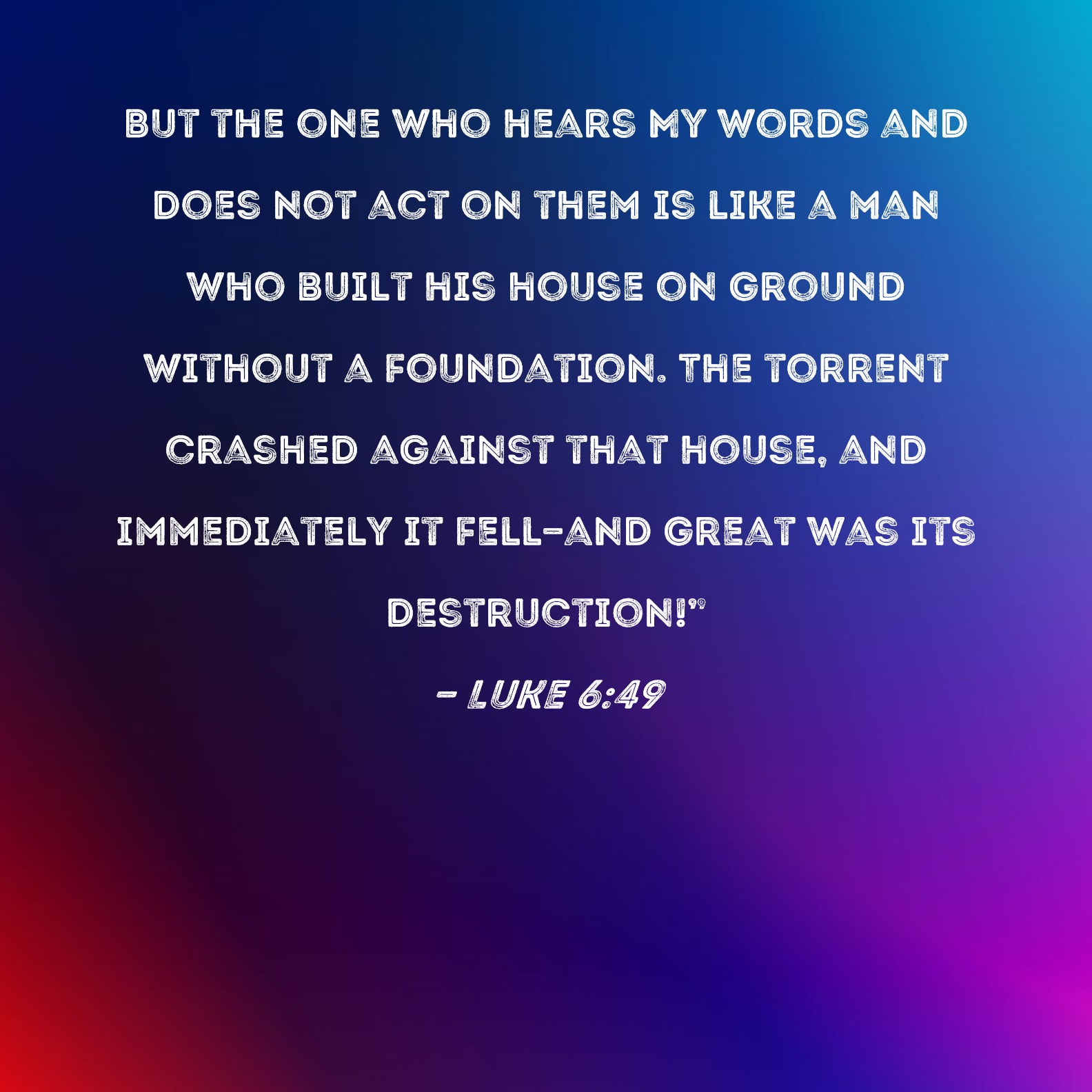 Luke 6:49 But the one who hears My words and does not act on them is like a man who built his house on ground without a foundation. The torrent crashed against that house, and immediately it fell--and great was its destruction!"