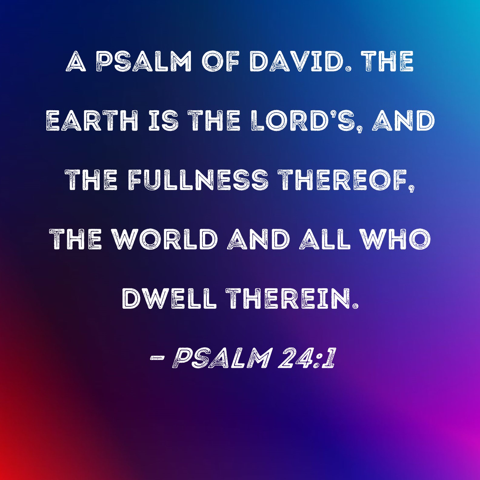 BSB: A Psalm of David. The earth is the LORD's, and the fullness thereof, the world and all who dwell therein. KJV: {A Psalm of David.} The earth is the LORD'S, and the fulness thereof; the world, and they that dwell therein. DRB: On the first day of the week, a psalm for David. The earth is the Lord's and the fulness thereof: the world, and all they that dwell therein. DBT: {Of David. A Psalm.} The earth is Jehovah's, and the fulness thereof; the world, and they that dwell therein. ERV: A Psalm of David. The earth is the LORD'S, and the fulness thereof; the world, and they that dwell therein. WBT: A Psalm of David. The earth is the LORD'S, and the fullness thereof; the world, and they that dwell therein. WEB: A Psalm by David. The earth is Yahweh’s, with its fullness; the world, and those who dwell in it. YLT: A Psalm of David. To Jehovah is the earth and its fulness, The world and the inhabitants in it.Links Psalm 24:1 NIV • Psalm 24:1 NLT • Psalm 24:1 ESV • Psalm 24:1 NASB • Psalm 24:1 KJV • Psalm 24:1 Interlinear • Psalm 24:1 Commentaries • Psalm 24:1 Parallel Texts • Psalm 24:1 Bible Apps • Psalm 24:1 Parallel • Bible Hub |