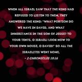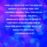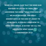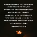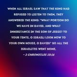 Pictures and Artwork When all Israel saw that the king had refused to listen to them, they answered the king: "What portion do we have in David, and what inheritance in the son of Jesse? To your tents, O Israel! Look now to your own house, O David!" So all the Israelites went home, |