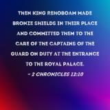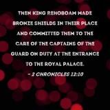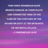Then King Rehoboam made bronze shields in their place and committed them to the care of the captains of the guard on duty at the entrance to the royal palace.