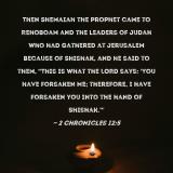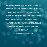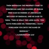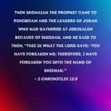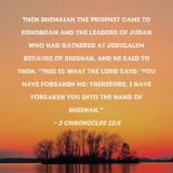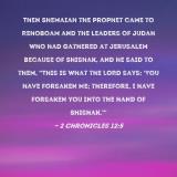 Pictures and Artwork Then Shemaiah the prophet came to Rehoboam and the leaders of Judah who had gathered at Jerusalem because of Shishak, and he said to them, "This is what the LORD says: 'You have forsaken Me; therefore, I have forsaken you into the hand of Shishak.'" |