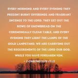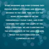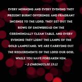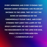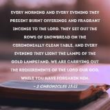 Pictures and Artwork Every morning and every evening they present burnt offerings and fragrant incense to the LORD. They set out the rows of showbread on the ceremonially clean table, and every evening they light the lamps of the gold lampstand. We are carrying out the requirements of the LORD our God, while you have forsaken Him. |