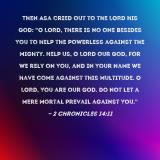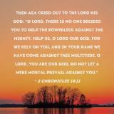 Pictures and Artwork Then Asa cried out to the LORD his God: "O LORD, there is no one besides You to help the powerless against the mighty. Help us, O LORD our God, for we rely on You, and in Your name we have come against this multitude. O LORD, You are our God. Do not let a mere mortal prevail against You." |