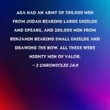 Asa had an army of 300,000 men from Judah bearing large shields and spears, and 280,000 men from Benjamin bearing small shields and drawing the bow. All these were mighty men of valor.