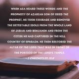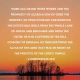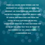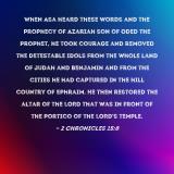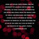 Pictures and Artwork When Asa heard these words and the prophecy of Azariah son of Oded the prophet, he took courage and removed the detestable idols from the whole land of Judah and Benjamin and from the cities he had captured in the hill country of Ephraim. He then restored the altar of the LORD that was in front of the portico of the LORD's temple. |