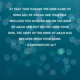 At that time Hanani the seer came to King Asa of Judah and told him, "Because you have relied on the king of Aram and not on the LORD your God, the army of the king of Aram has escaped from your hand.