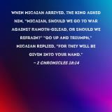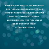 When Micaiah arrived, the king asked him, "Micaiah, should we go to war against Ramoth-gilead, or should we refrain?" "Go up and triumph," Micaiah replied, "for they will be given into your hand."