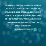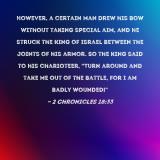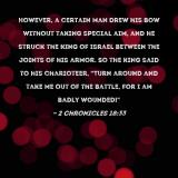 Pictures and Artwork However, a certain man drew his bow without taking special aim, and he struck the king of Israel between the joints of his armor. So the king said to his charioteer, "Turn around and take me out of the battle, for I am badly wounded!" |