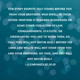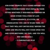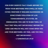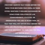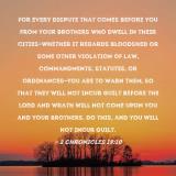 Pictures and Artwork For every dispute that comes before you from your brothers who dwell in their cities--whether it regards bloodshed or some other violation of law, commandments, statutes, or ordinances--you are to warn them, so that they will not incur guilt before the LORD and wrath will not come upon you and your brothers. Do this, and you will not incur guilt. |