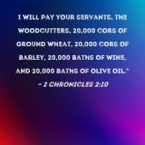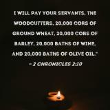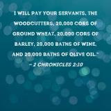 I will pay your servants, the woodcutters, 20,000 cors of ground wheat, 20,000 cors of barley, 20,000 baths of wine, and 20,000 baths of olive oil."