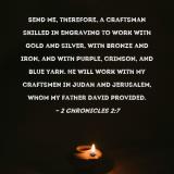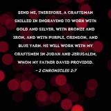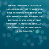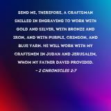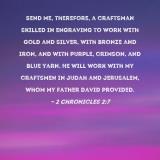 Pictures and Artwork Send me, therefore, a craftsman skilled in engraving to work with gold and silver, with bronze and iron, and with purple, crimson, and blue yarn. He will work with my craftsmen in Judah and Jerusalem, whom my father David provided. |