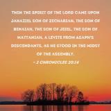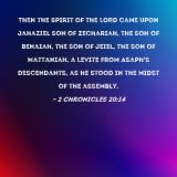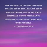 Then the Spirit of the LORD came upon Jahaziel son of Zechariah, the son of Benaiah, the son of Jeiel, the son of Mattaniah, a Levite from Asaph's descendants, as he stood in the midst of the assembly.