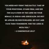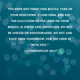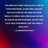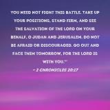 Pictures and Artwork You need not fight this battle. Take up your positions, stand firm, and see the salvation of the LORD on your behalf, O Judah and Jerusalem. Do not be afraid or discouraged. Go out and face them tomorrow, for the LORD is with you.'" |