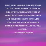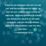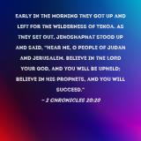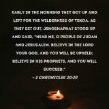 Pictures and Artwork Early in the morning they got up and left for the Wilderness of Tekoa. As they set out, Jehoshaphat stood up and said, "Hear me, O people of Judah and Jerusalem. Believe in the LORD your God, and you will be upheld; believe in His prophets, and you will succeed." |
