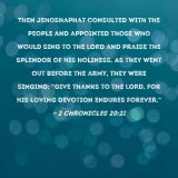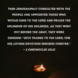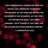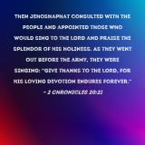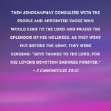 Pictures and Artwork Then Jehoshaphat consulted with the people and appointed those who would sing to the LORD and praise the splendor of His holiness. As they went out before the army, they were singing: "Give thanks to the LORD, for His loving devotion endures forever." |