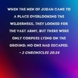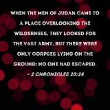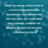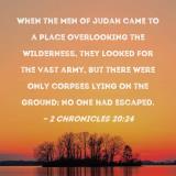 When the men of Judah came to a place overlooking the wilderness, they looked for the vast army, but there were only corpses lying on the ground; no one had escaped.