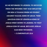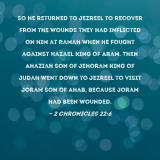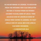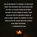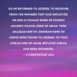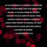 Pictures and Artwork so he returned to Jezreel to recover from the wounds they had inflicted on him at Ramah when he fought against Hazael king of Aram. Then Ahaziah son of Jehoram king of Judah went down to Jezreel to visit Joram son of Ahab, because Joram had been wounded. |