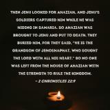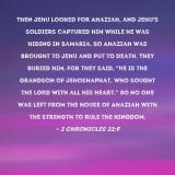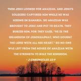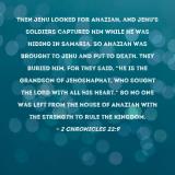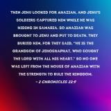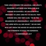 Pictures and Artwork Then Jehu looked for Ahaziah, and Jehu's soldiers captured him while he was hiding in Samaria. So Ahaziah was brought to Jehu and put to death. They buried him, for they said, "He is the grandson of Jehoshaphat, who sought the LORD with all his heart." So no one was left from the house of Ahaziah with the strength to rule the kingdom. |