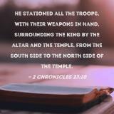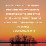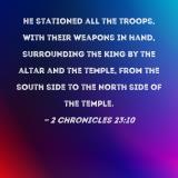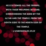 He stationed all the troops, with their weapons in hand, surrounding the king by the altar and the temple, from the south side to the north side of the temple.