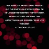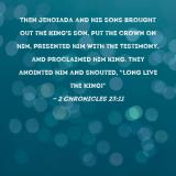 Then Jehoiada and his sons brought out the king's son, put the crown on him, presented him with the Testimony, and proclaimed him king. They anointed him and shouted, "Long live the king!"