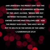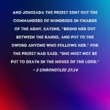 Pictures and Artwork And Jehoiada the priest sent out the commanders of hundreds in charge of the army, saying, "Bring her out between the ranks, and put to the sword anyone who follows her." For the priest had said, "She must not be put to death in the house of the LORD." |
