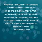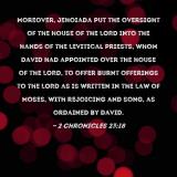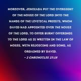 Pictures and Artwork Moreover, Jehoiada put the oversight of the house of the LORD into the hands of the Levitical priests, whom David had appointed over the house of the LORD, to offer burnt offerings to the LORD as is written in the Law of Moses, with rejoicing and song, as ordained by David. |