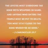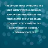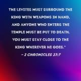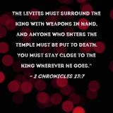 The Levites must surround the king with weapons in hand, and anyone who enters the temple must be put to death. You must stay close to the king wherever he goes."