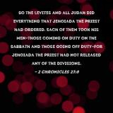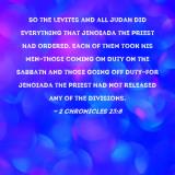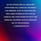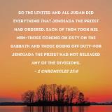 Pictures and Artwork So the Levites and all Judah did everything that Jehoiada the priest had ordered. Each of them took his men--those coming on duty on the Sabbath and those going off duty--for Jehoiada the priest had not released any of the divisions. |