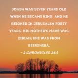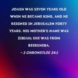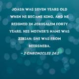 Joash was seven years old when he became king, and he reigned in Jerusalem forty years. His mother's name was Zibiah; she was from Beersheba.