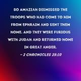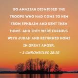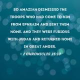 So Amaziah dismissed the troops who had come to him from Ephraim and sent them home. And they were furious with Judah and returned home in great anger.