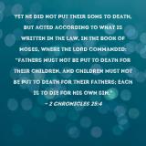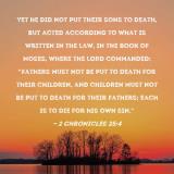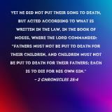 Pictures and Artwork Yet he did not put their sons to death, but acted according to what is written in the Law, in the Book of Moses, where the LORD commanded: "Fathers must not be put to death for their children, and children must not be put to death for their fathers; each is to die for his own sin." |
