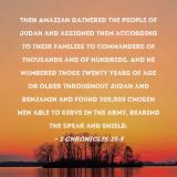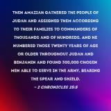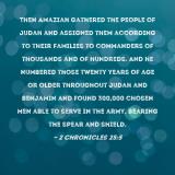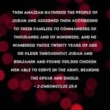 Pictures and Artwork Then Amaziah gathered the people of Judah and assigned them according to their families to commanders of thousands and of hundreds. And he numbered those twenty years of age or older throughout Judah and Benjamin and found 300,000 chosen men able to serve in the army, bearing the spear and shield. |