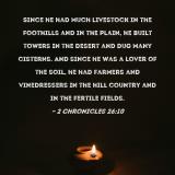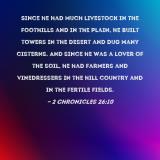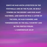 Pictures and Artwork Since he had much livestock in the foothills and in the plain, he built towers in the desert and dug many cisterns. And since he was a lover of the soil, he had farmers and vinedressers in the hill country and in the fertile fields. |