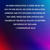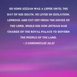 So King Uzziah was a leper until the day of his death. He lived in isolation, leprous and cut off from the house of the LORD, while his son Jotham had charge of the royal palace to govern the people of the land.