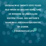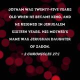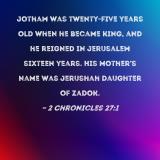 Jotham was twenty-five years old when he became king, and he reigned in Jerusalem sixteen years. His mother's name was Jerushah daughter of Zadok.